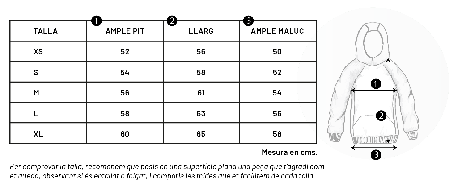 Si tens dubtes entre dues talles per a les nostres dessuadores de cotó, et recomanem escollir la més gran. El cotó pot encongir lleugerament (fins a un 6%) després del rentat, i volem assegurar-nos que gaudeixis de la màxima comoditat.